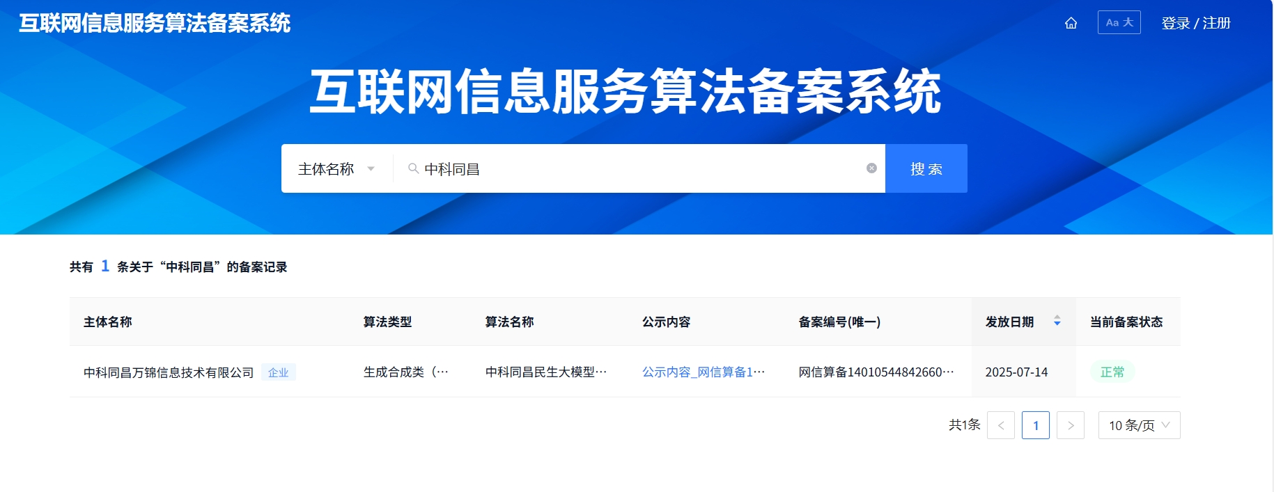 7月14日,国家网信办公布第十二批深度合成服务算法备案名单,我省企业中科同昌万锦信息技术有限公司(以下简称中科同昌)自主研发的“中科同昌民生大模型算法”正式通过国家级审核,标志着该算法在技术规范性与安全可控性上获得权威认可。