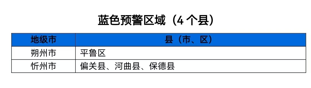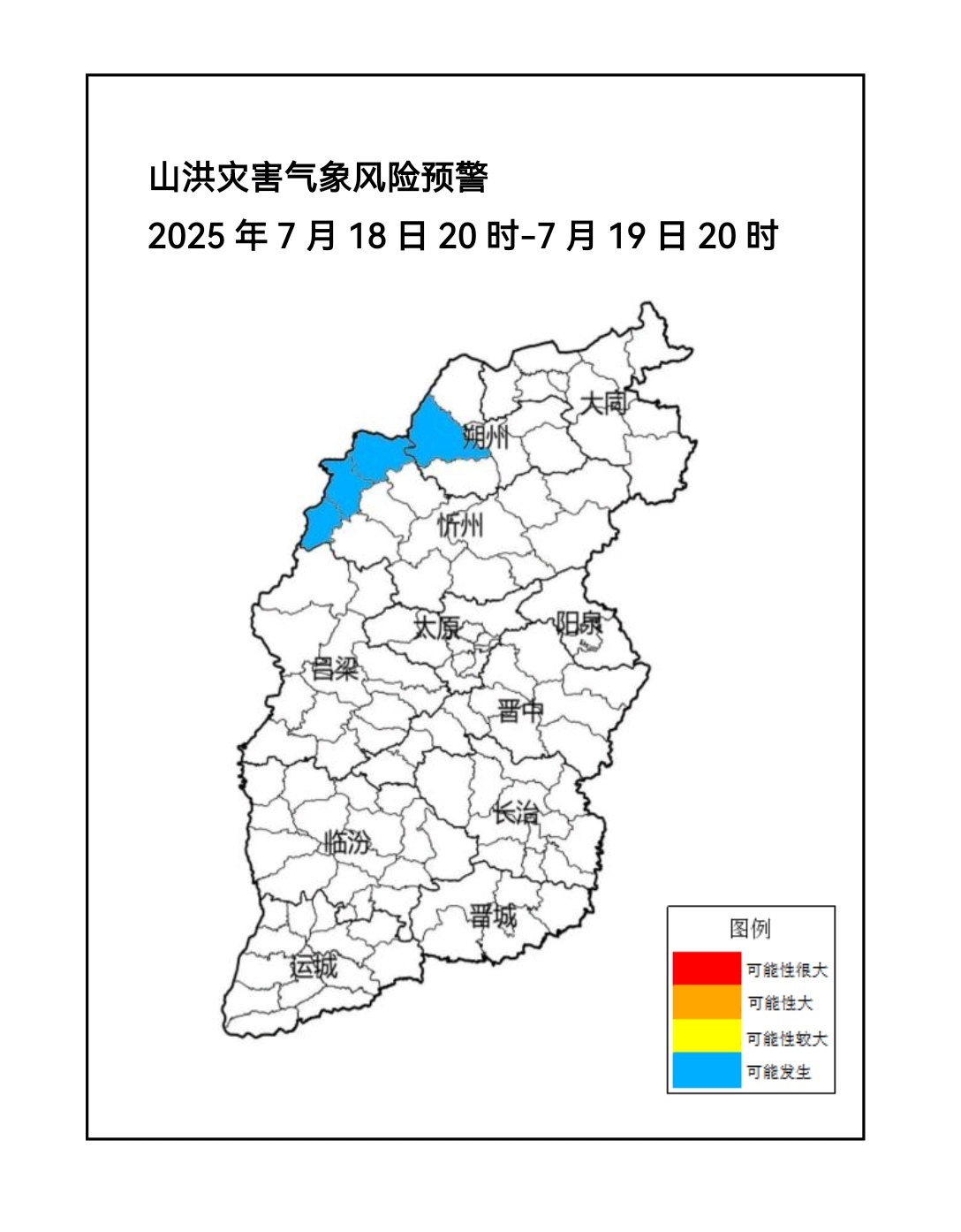 预计,2025年7月18日20时至7月19日20时,受强降雨影响,我省朔州中西部、忻州西部2个市4个县可能发生山洪(蓝色预警)。其他地区也可能因局地短历时强降水引发山洪灾害,各地注意做好实时监测、防汛预警和转移避险等防范工作。