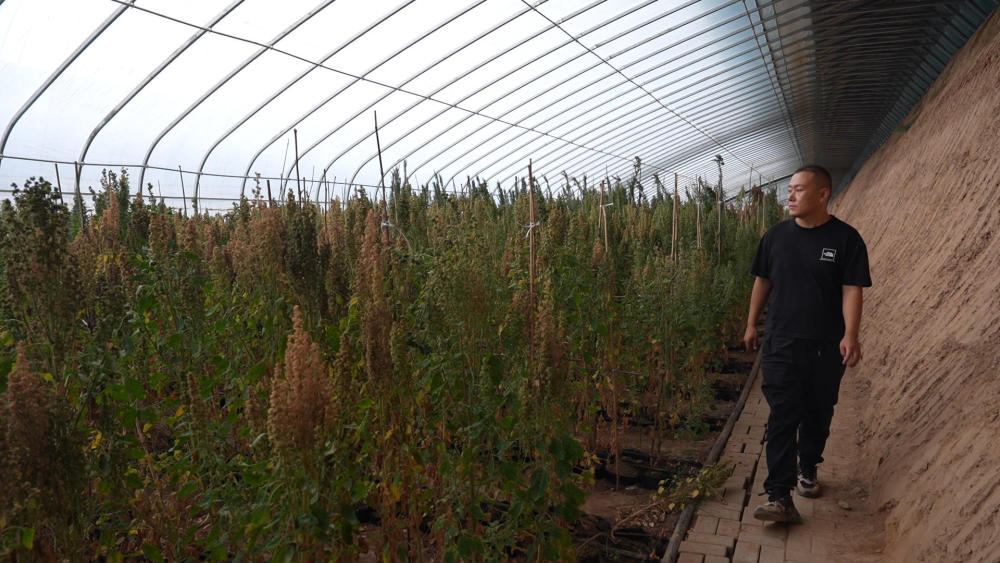 在山西省忻州市静乐县的中国藜麦之乡产业园内,农艺师郝志峰在日光温室育种试验大棚内查看藜麦长势(7月1日摄)。