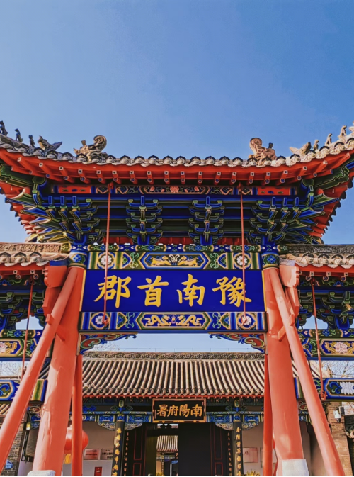 蓝天下,南阳府署前的“豫南首郡”牌坊巍峨矗立。彩漆精心绘就古韵,飞檐奋力挑起晴空,历史的厚重与今日的鲜活在此碰撞、交融。站在坊下,仿佛能一眼望尽千年烟火,触摸到这座城从过往走来的温度,感受它在岁月流转中始终跳动的脉搏,古老与新生,就这样和谐共生。