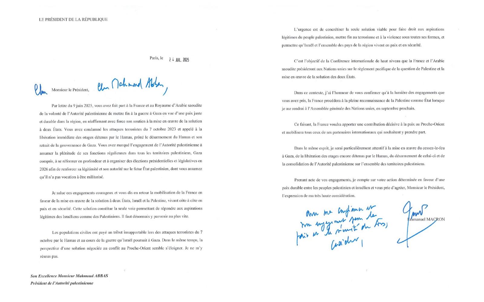 马克龙还同时公开了一封写给巴勒斯坦总统阿巴斯的正式信函,强调法国支持“两国方案”,并肯定阿巴斯在推动停火等方面作出的承诺。