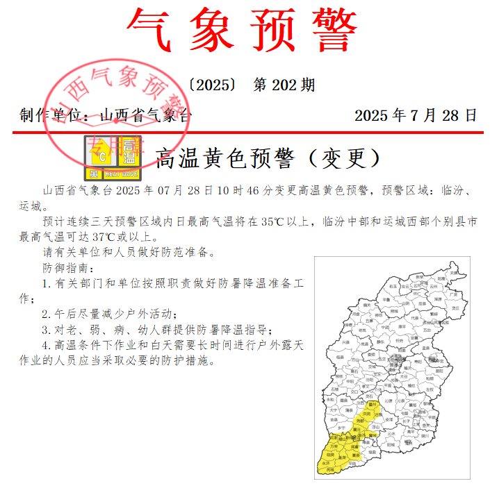 近期临汾运城持续高温,明后天最高气温接近40°C,最低气温也在26°C+,白天炎热,晚上闷热,高温高湿也非常容易中暑,建议合理使用空调,白天外出做好防晒的准备工作,多喝水。