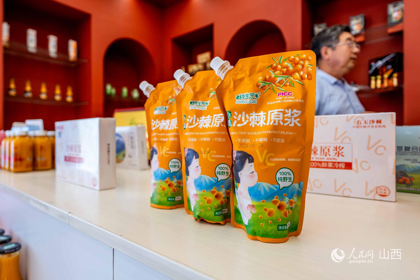 右玉县沙棘研究所内展示的6个系列28种沙棘产品。人民网 马梦迪摄