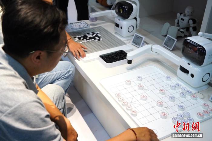 8月6日,北京,参观者和全球首家具身智能机器人4S店内展示的机器人下棋。张天润 摄