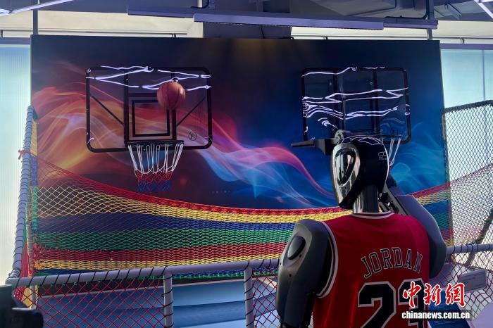 8月6日,北京,全球首家具身智能机器人4S店内展示的机器人进行篮球投篮。中新社记者 徐婧 摄