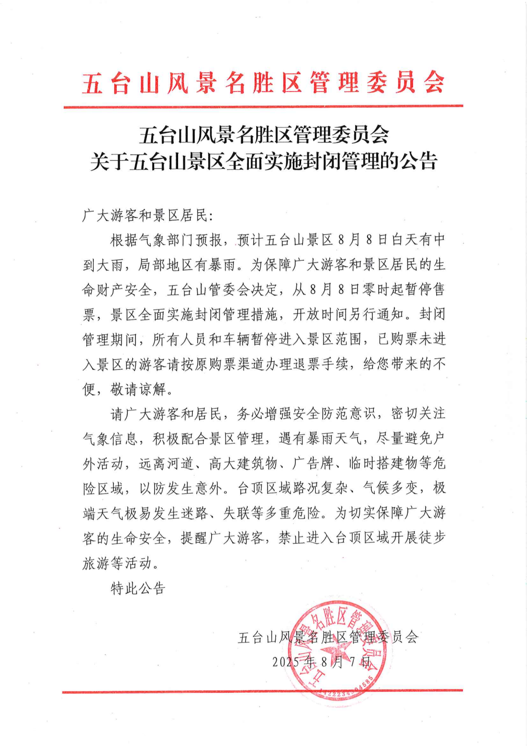 根据气象部门预报,预计五台山景区8月8日白天有中到大雨,局部地区有暴雨。为保障广大游客和景区居民的生命财产安全,五台山管委会决定,从8月8日零时起暂停售票,景区全面实施封闭管理措施,开放时间另行通知。封闭管理期间,所有人员和车辆暂停进入景区范围,已购票未进入景区的游客请按原购票渠道办理退票手续,给您带来的不便,敬请谅解。