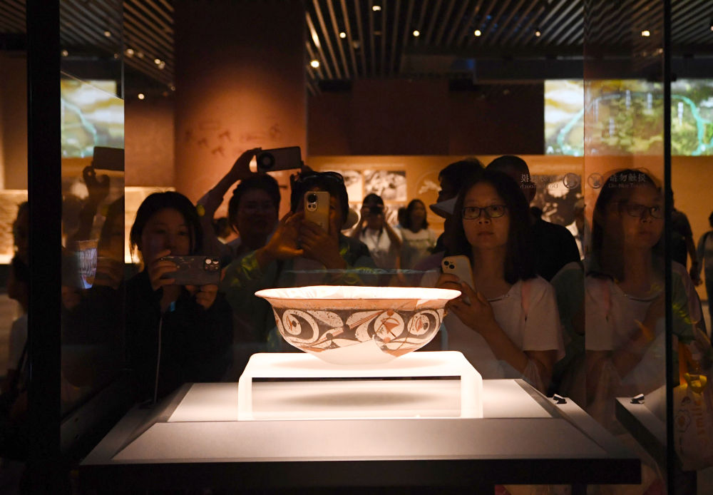 2025年6月14日,参观者在大河村遗址博物馆新馆观看展品。新华社记者 郝源 摄