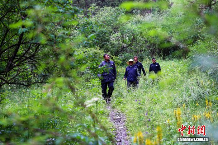图为果洛赞保(左一)进行日常巡护工作。薛蒂 摄