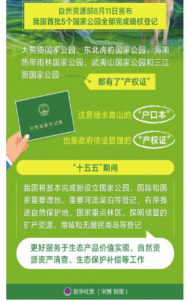 自然资源部8月11日宣布,我国首批5个国家公园全部完成确权登记。大熊猫、东北虎豹、海南热带雨林、武夷山和三江源国家公园都有了“产权证”。这“产权证”不一般,经国务院授权,由自然资源部委托,行使所有权的是中央人民政府或受委托省级人民政府。