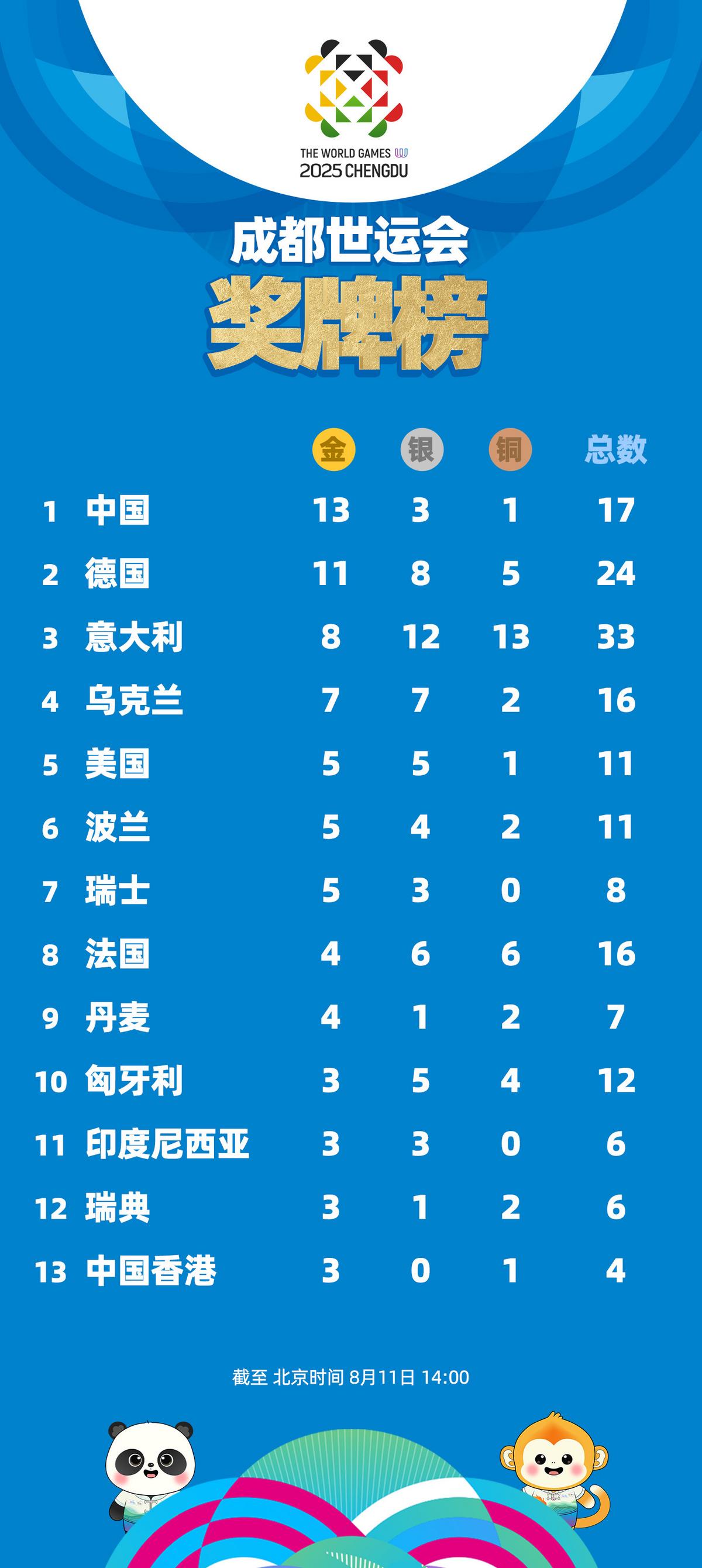 截至北京时间8月11日14时,中国体育代表团以13金暂列成都世界运动会奖牌榜榜首。