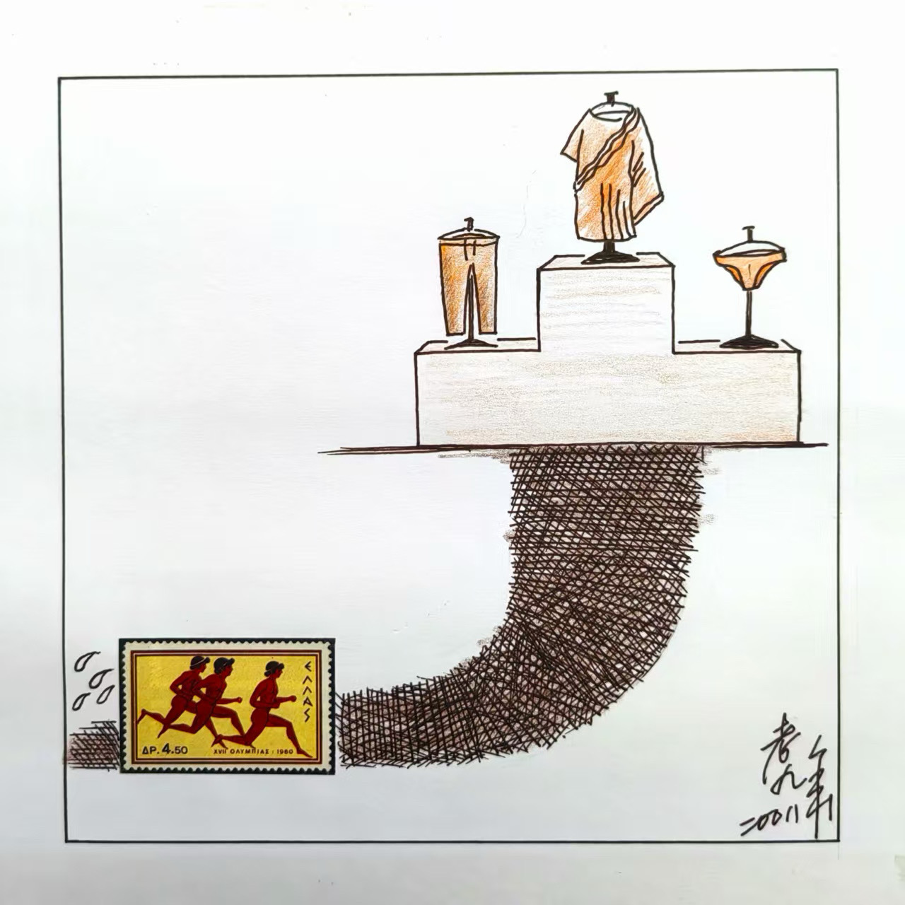 老九本名王九成,不仅是中国戏曲学院舞台美术系教授、戏曲动漫硕士导师,更是“老九集邮幽默画”的创始人。他迄今发表漫画3000余幅,多次获海内外奖项,作品曾入选中国漫画大展、首届亚欧文化艺术节,还拿过“世界华人艺术大奖赛”国际荣誉金奖。