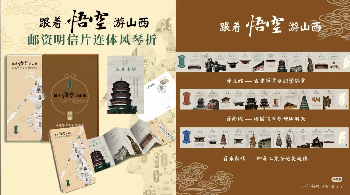 《黑神话·悟空》风靡全球,山西贡献了27处景点资源,文旅厅推出了“跟着悟空游山西”的三条线路,山西邮政创新推出了极具收藏和纪念价值的连体明信片风琴折。这套明信片一共三册,对应晋北、晋南、晋东南三条线路,包含了34处古建景点。