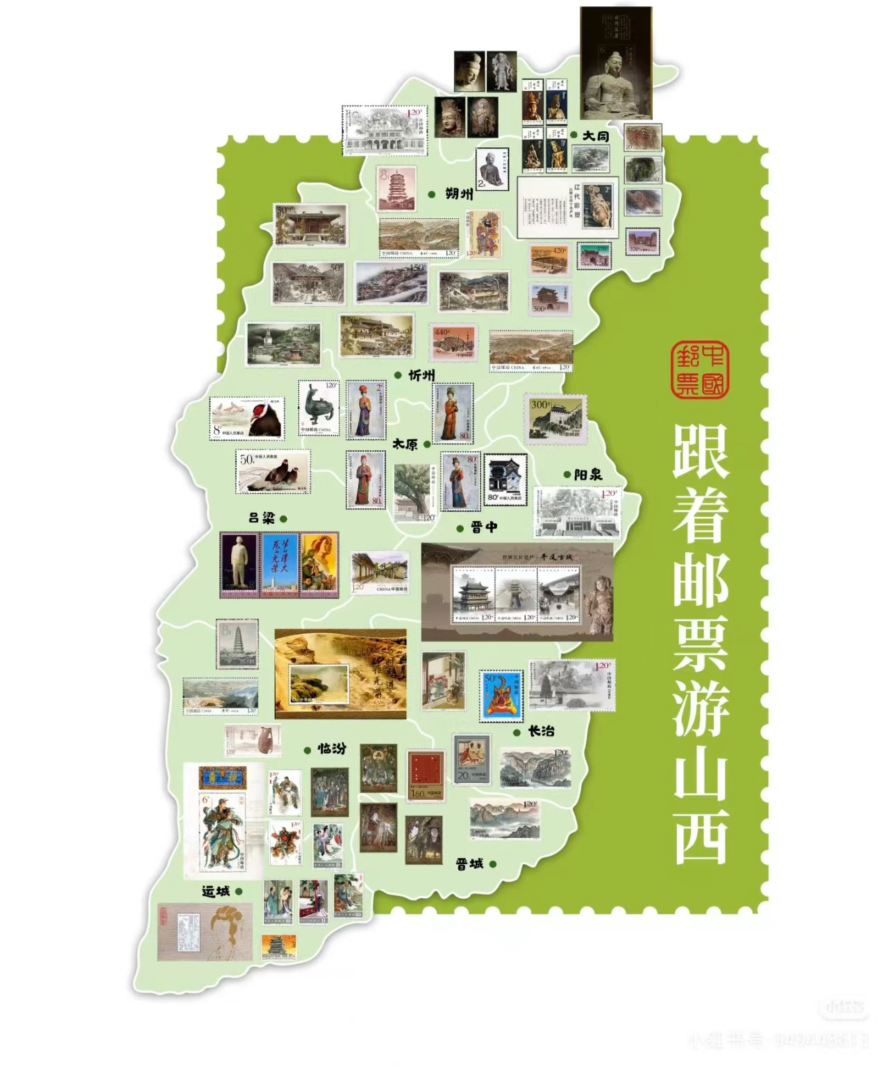 邮票被誉为“国家名片”“百科全书”。中国邮政将中华文化浓缩于方寸之间,传递至四海八荒。自新中国成立以来,中国邮政已发行65套、140枚山西题材邮票。从平遥古城、云冈石窟、五台山世界文化遗产,到长城、黄河、太行山表里山河;从文人墨客关汉卿、司马光到廉吏名将关公、于成龙,从古建壁画到晋祠彩塑……方寸之间,生动记录并传播着华夏古文明与山西好风光。特别是近两年,陶寺遗址、古树名木、运城盐湖等新题材也荣登“国家名片”,更见证了山西在文化遗产保护、生态发展利用等方面的新成就。