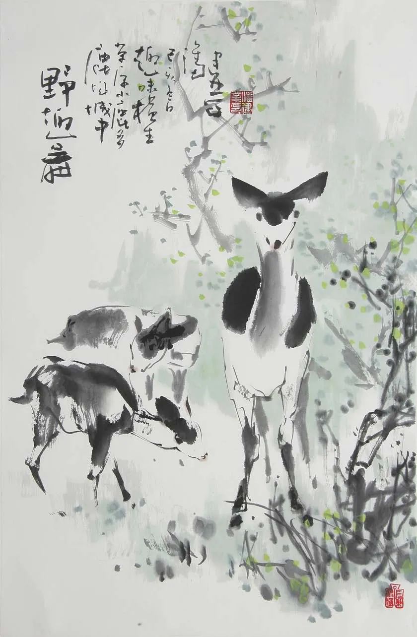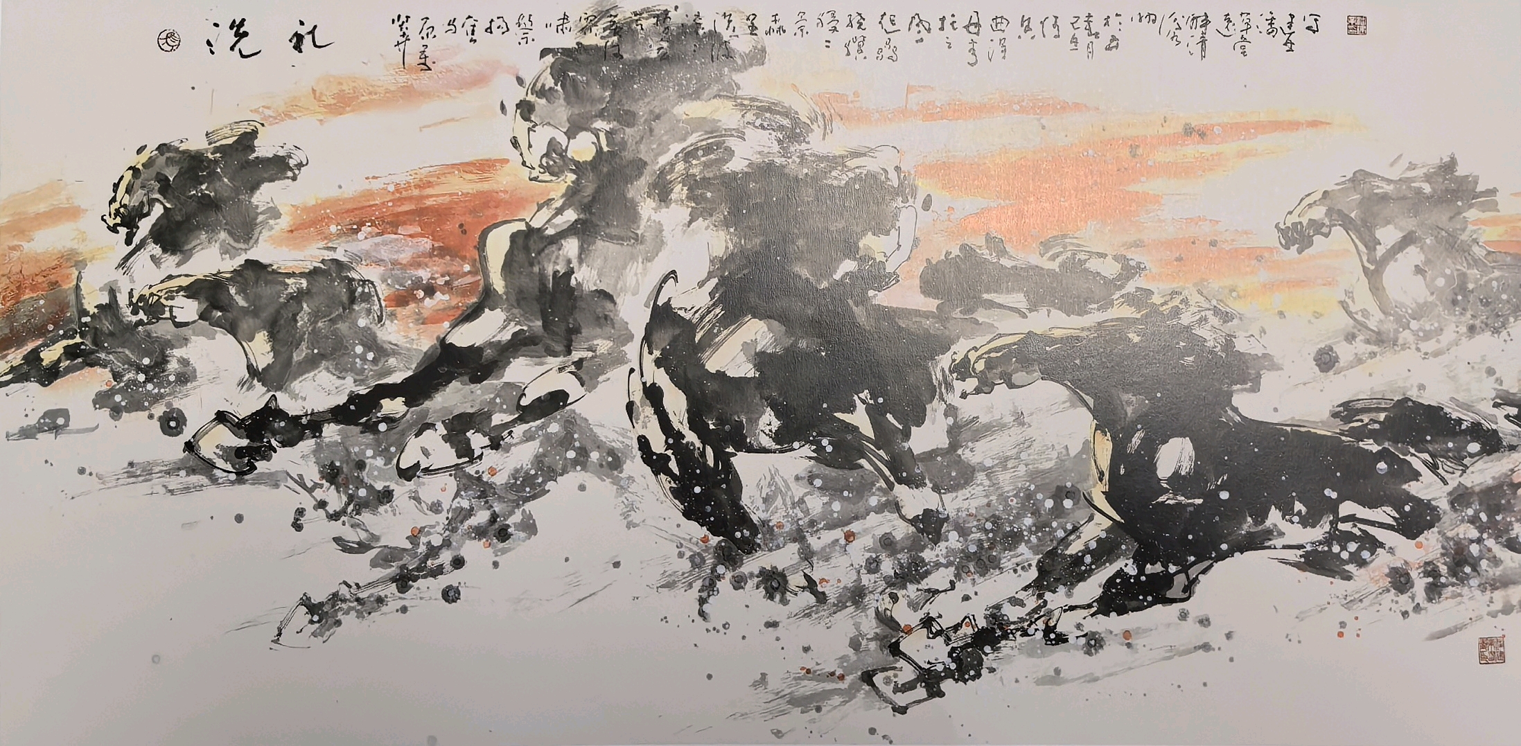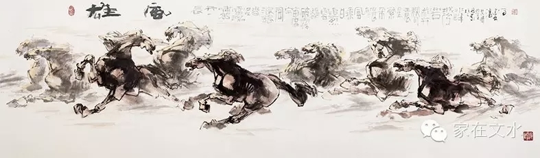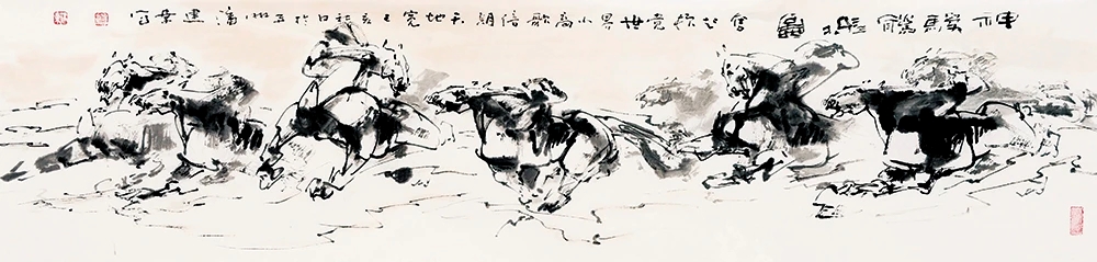 潘建业像所有热爱画马的艺术家一样,对画马情有独钟。画马艺术的发展,各个朝代有其时代的风气。汉画像石的奔马,飞扬跋扈,奔腾嘶啸,茂陵石雕《马踏匈奴》等的造型浑穆雄强,也像画像石中奔马那样,包含着一种精神力量,使观者震慑。盛唐时画马,文献记载极多,而最可确信的真迹,应为章怀太子墓壁画《狩猎出行图》等。潘建业不仅从古文化中借鉴,还每年到草原上,仔细观察研究马怎样生活以及生活的环境,观看草原上的蓝天白云,体味牧马人和马之间的关系。他要求马的主人在凌晨把马赶起来,他站高处俯瞰,一百多匹骏马来回奔腾嘶鸣,那扑面而来奔涌而至的壮观场面,那凌空飞腾的气势与群马奔驰的雄健他都心记手摹。他还从各个角度观察马,观看马雄健的肌肉,强壮的骨骼,跳跃的姿态。从而能够成马在胸,游刃有余地采用前人不敢轻易涉猎的大角度透视,创作出崭新的艺术形象。潘建业笔下的马,泼墨写意或兼工带写,塑造了千姿百态、倜傥洒脱的马,或奔腾跳跃、或回首长嘶、或腾空而起、或四蹄生烟……他画的马既有西方绘画中的造型,又有中国传统绘画中的写意,融中西绘画之长于一炉,笔墨酣畅,气韵生动。因而,潘建业先生的马有着“潘家马”之美誉。