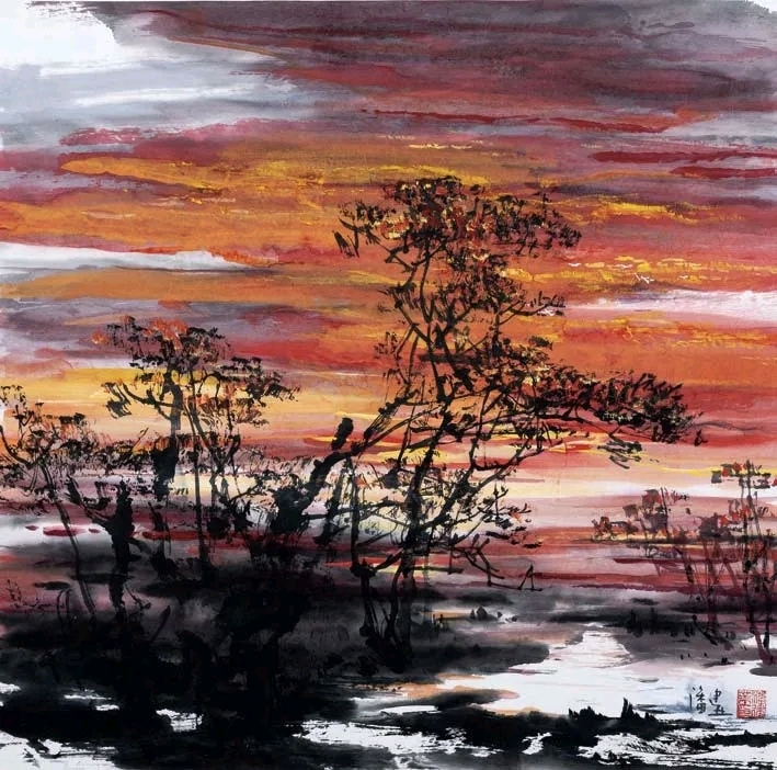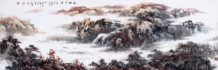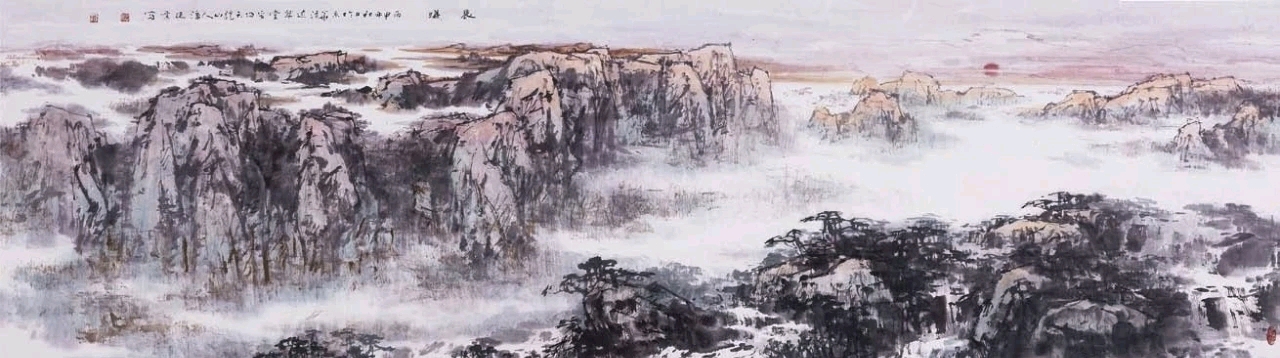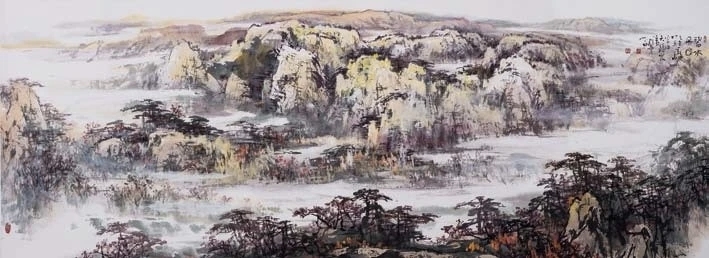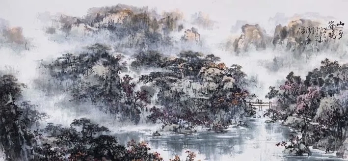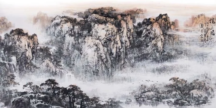 潘建业先生“外师造化,中得心源”,他的山水画转益多师,兼有南派的清灵秀润和北派的雄壮宏伟,融苍秀阴柔和奇峭阳刚于一炉,同时把西画强调光的特点融入画中,以突出画面的质感和凹凸感,笔法灵活多变、刚柔相济,墨法丰厚苍茫、浓淡相间。他师法米芾,运用破墨、积墨、焦墨,构成深深浅浅、浓浓淡淡的“点”,有时用赭、绿、青、黛等色“施点”,突出画面效果。