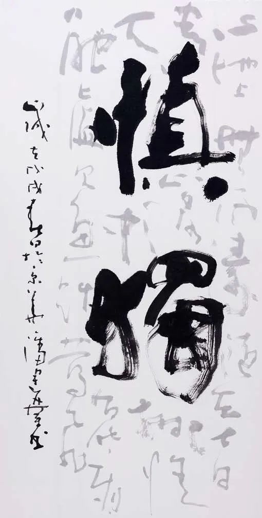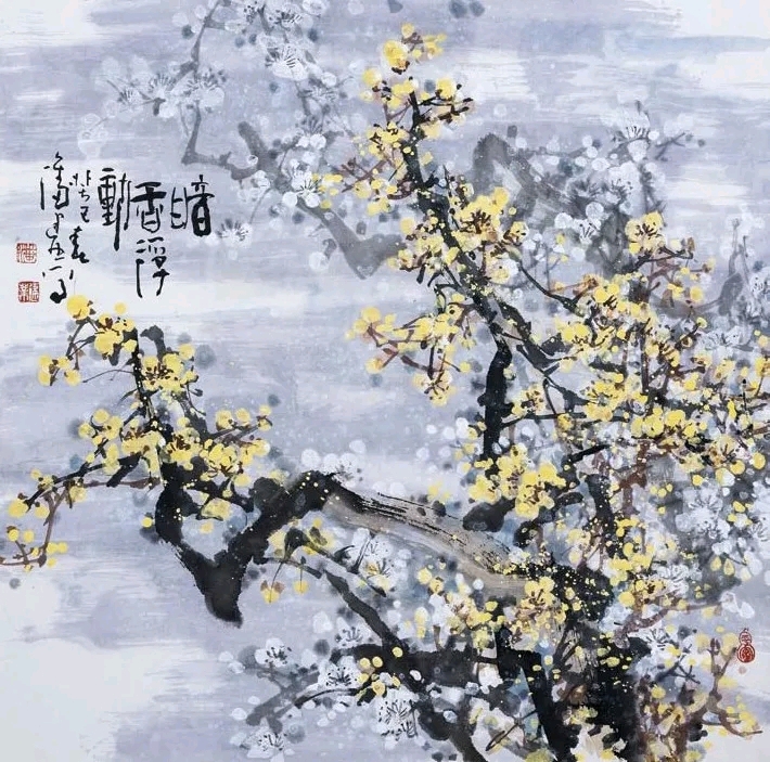 作品《梅花》中,梅枝由左中和左上出枝,蜿蜒向图右中下伸展,复又向左下倾斜。以浓、淡、白三分层次,枝干曲屈,繁花缀满,似笙管齐鸣,不见冬之萧瑟,却感春意盎然。作者运笔中有一种西画素描的光感,于是在平面的构图中更显一种空间深度。画面中茫茫天地间,飞雪飘舞,梅花傲雪怒放,点点簇簇,或隐或现,好似跃动的音符,点缀于枝干之间,而枝干上的斑结,或疾或徐,如深厚的鼓点,打出了乐章的节奏。