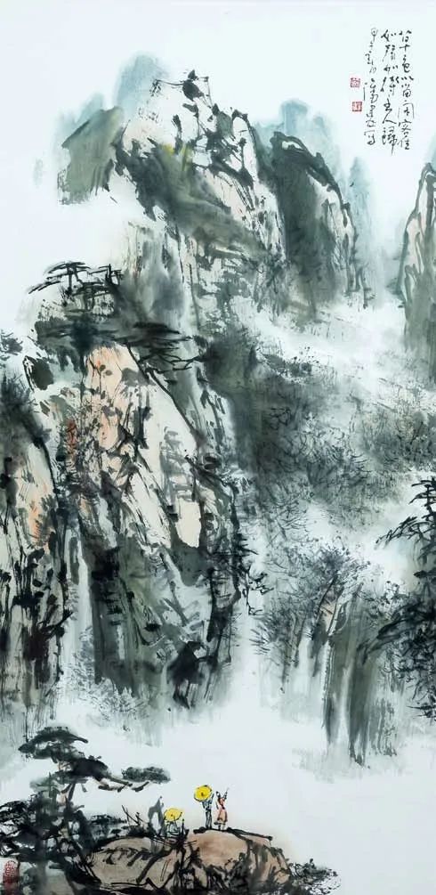 作品《家园》中,千峰竞秀,林木茂盛,苍松滴翠,近处山峦起伏,行云流水,飞鸟啁啾,美不胜收。水边有一钓者,神态悠然。隐隐约约的石径直通向云天深处,正是“远上寒山石径斜,白云生处有人家”,呼应了作者对心灵深处秀丽家园的渴望,也点明了题跋里的寓意:我家山巍峨,云中有院落。纵观潘建业的山水画,深悟董源巨然之绘画妙理,山雄壮、水澄明、物蓬勃、寄寓深,具有很强的装饰意味。