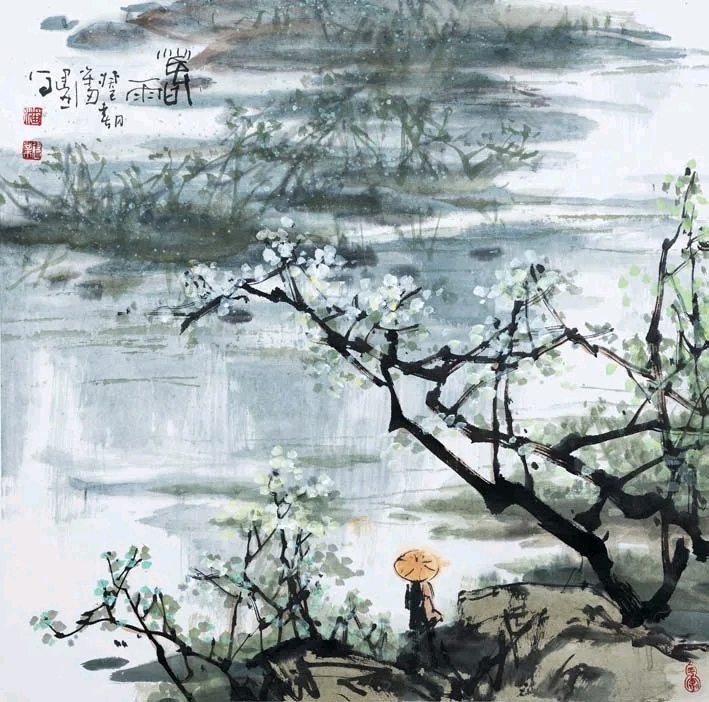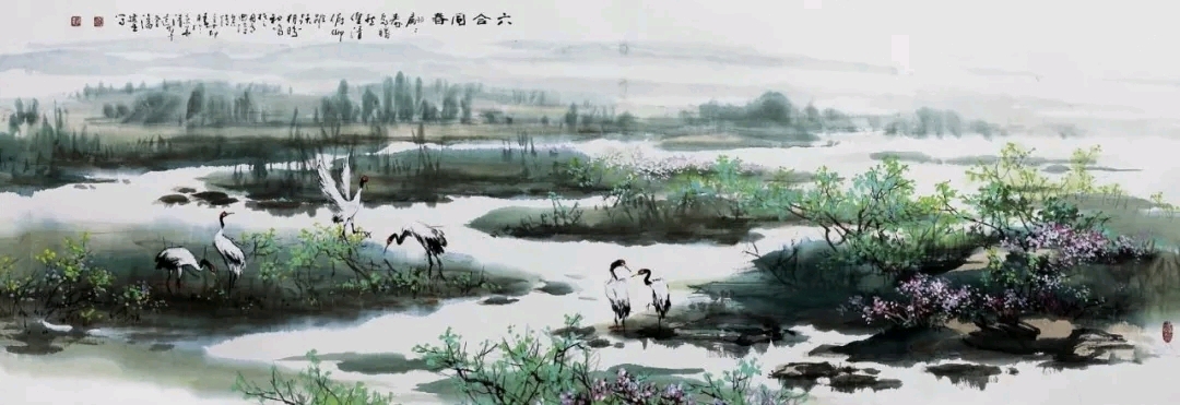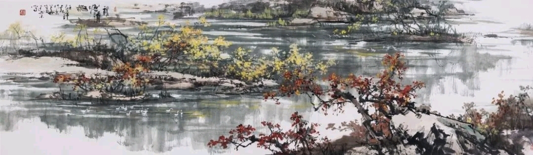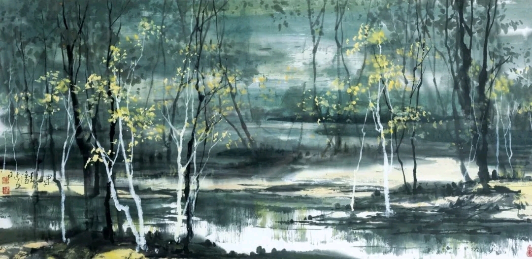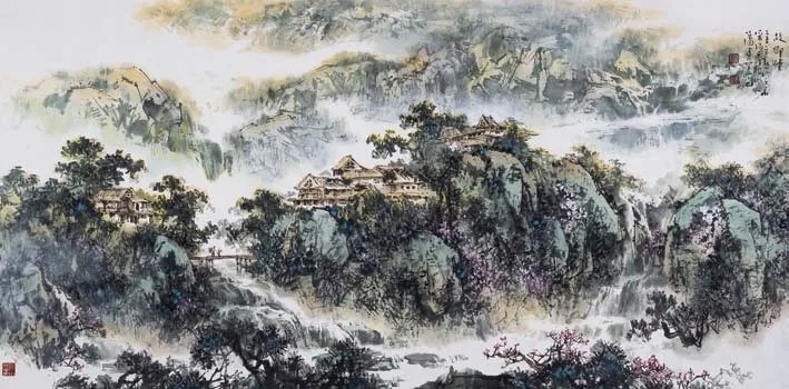 作品《春来遍是桃花水》中,远山和近景巧妙自然地融会在一起,作者运用点、擦、皴、染,描绘出一幅清幽雅静、缓绵柔婉、温润清净的山水图,近景是一湾蜿蜒的碧波,作者用留白和岸边的倒影表现澄澈清亮的水,水面上有悠闲的神态各异的天鹅,两岸写意的山坡上长满姿态万千花色浓郁的桃树,各色浓淡不一的“点”修饰出桃花的艳丽和妩媚,画面寓静于动,动静相宜。远山则雄浑秀逸,云雾氤氲。此图结构精微,看起来十分密实,但密中不见塞,实中仍见虚,富于幽邃空灵的空间感。