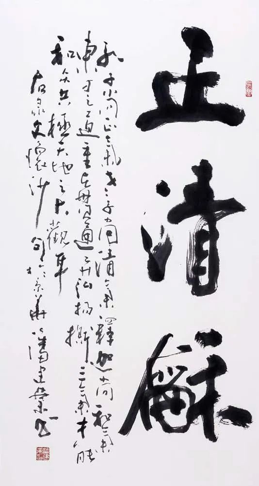 潘建业先生的书法可谓独树一帜,别具风格,很难从他的书法作品里看出他的字是何体,他遍临书家众帖,喜欢把美术的构图、用笔、理念融会到书法创作里,把楷、行、草、篆、隶等糅到一起,书中见画,画中见书,形成了博大浑厚、豪放奇崛的书风。作品《清气若兰》中,潘建业写“若”字时,草头用了篆书,口则用了隶书,作品里面的山字则直接用象形文画了一个山。他的字还根据内容的需要随时变换风格,于雄浑处见遒劲,于秀雅处见丰润,纵逸跌宕,自出胸臆,率真之中生气郁勃,气度非凡。其书写的“猴”“鸡”70米书法作品,在2016年丙申猴年、2017年丁酉鸡年均荣登迪拜七星级亚美尼亚帆船大酒店室外墙体,潘先生说:“把中国年吉祥的良好祝愿传播出去,让世界更美好,和平万岁!”