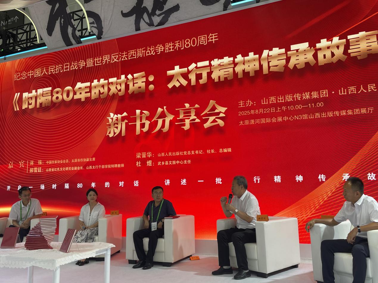 第七届文博会开幕以来,太原潇河国际会展中心N3馆山西出版传媒集团展厅火爆异常,读书分享会是现场爆点之一。8月22日上午,《时隔80年的对话:太行精神传承故事》新书分享会如期举行。5位嘉宾围绕该书创作初心、太行精神传承故事、红色资源保护实践等话题,结合自身经历与研究实践展开深入交流。这场跨越80年的对话,为这场文化盛会注入了浓郁的红色底蕴。