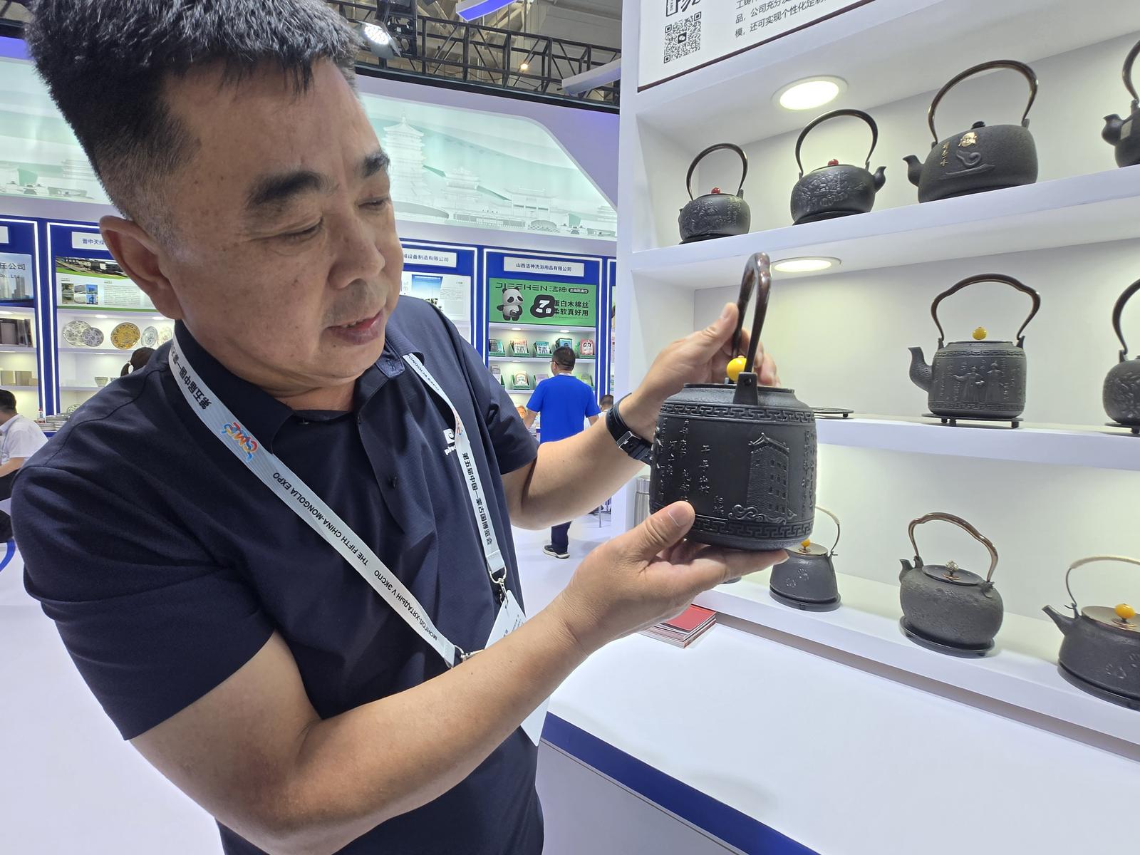 工艺品展区成为“文化输出”高地。晋艺坊手工铁壶、山西文旅铁艺制作有限公司铁壶、山西金砂紫陶股份有限公司非遗紫砂系列产品,将非遗技艺与现代设计巧妙结合;山西宇达青铜文化艺术股份有限公司带来的关公、国礼针灸铜人等青铜艺术品,传承三晋文化基因,成为文化交流的重要载体。