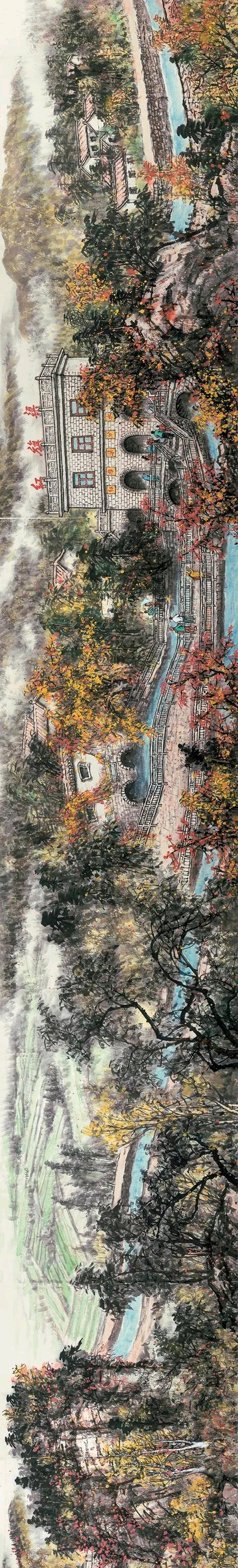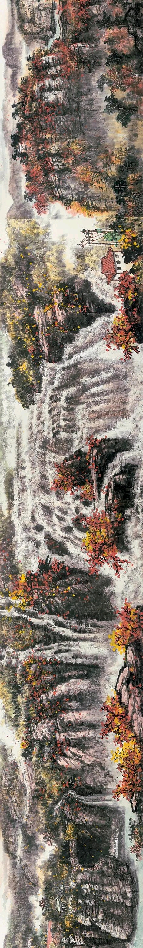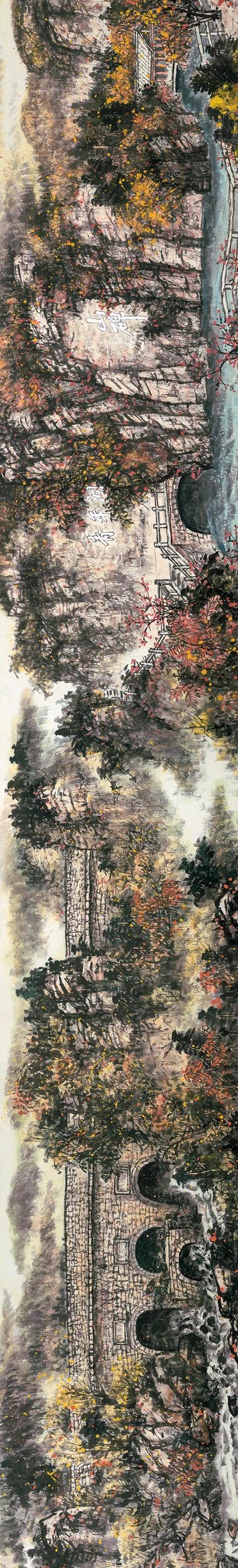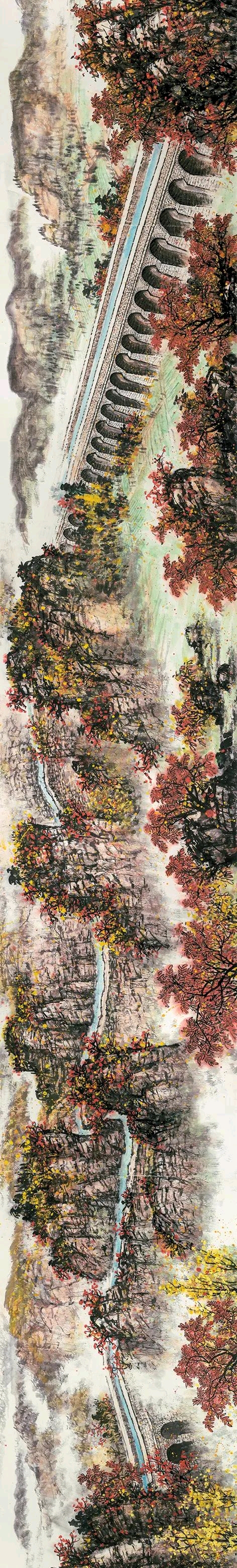 这件鸿篇巨制在整体布局和绘画元素上,涵盖了中国山水画几乎所有的细节,山峦起伏与引水工程纵横铺陈相互融合,形成全景鸟瞰式构图,画面宏大,气吞山河,以艺术形式再现“人工天河”这一人类奇迹,它不仅仅是一幅画,更是一首用笔墨绘就的史诗,堪称传世之作。2022年7月22日,在山西美术馆首展面世后,即引起轰动,受到社会各界广泛关注。