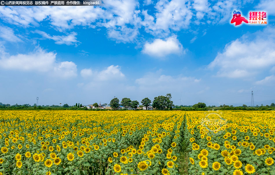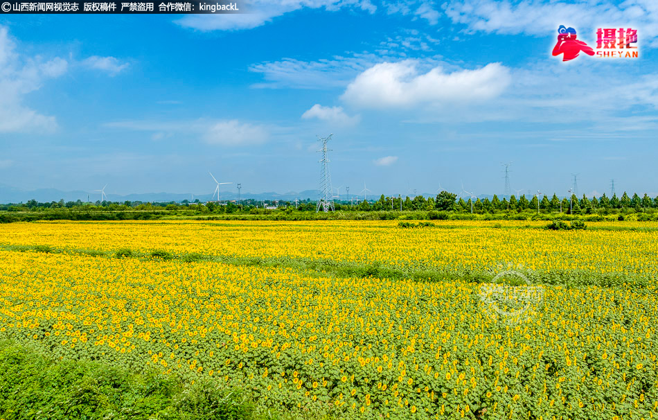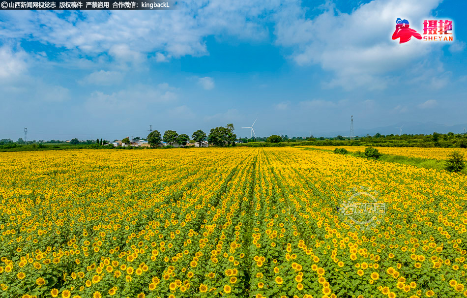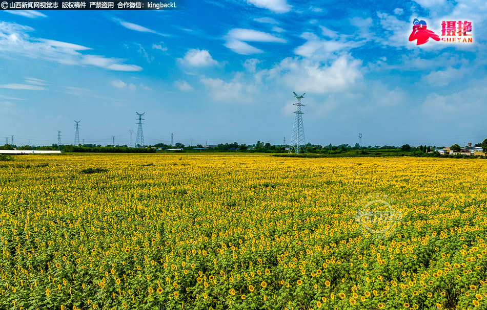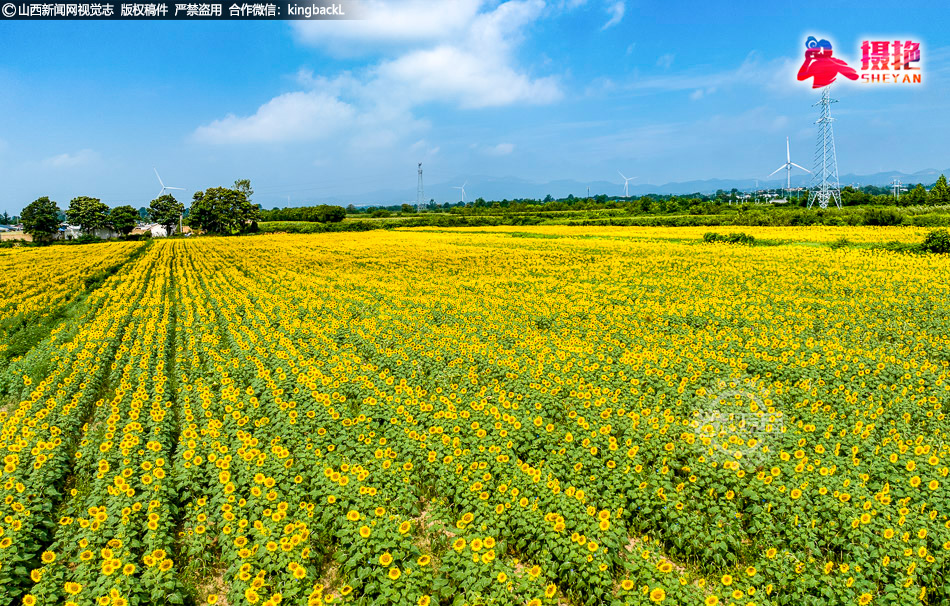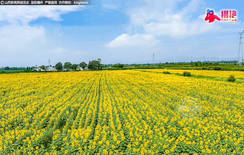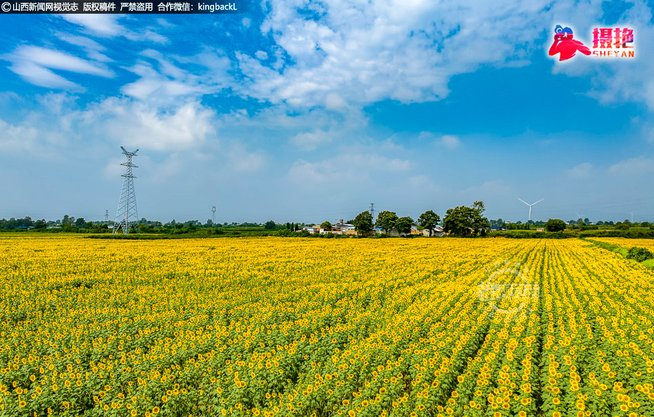 8月17日,山西省运城市平陆县部官镇广袤田野间向日葵竞相盛放。航拍视角下,金黄花田如大地织就的华美地毯,游客拍照赏景,沉浸式感受田园魅力。