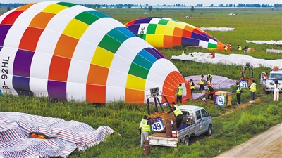 8月26日早,参加全国热气球锦标赛的五十支队伍进行了“游荡华尔兹”“飞向主会场”“空中自选目标”三个任务的比赛。 张占兵摄