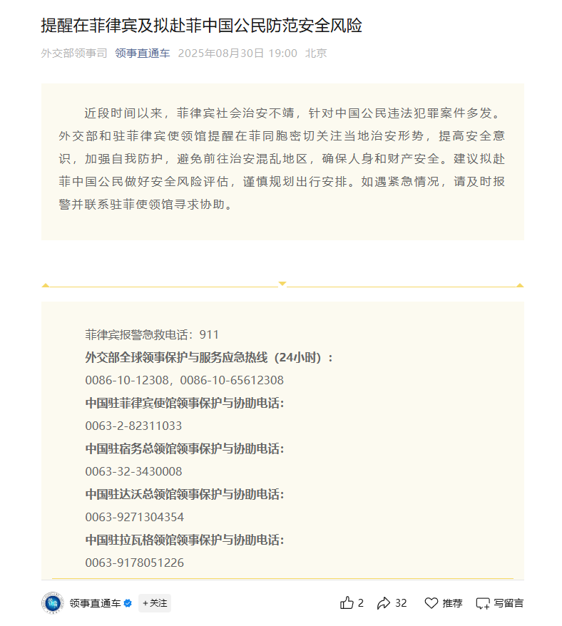 近段时间以来,菲律宾社会治安不靖,针对中国公民违法犯罪案件多发。外交部和驻菲律宾使领馆提醒在菲同胞密切关注当地治安形势,提高安全意识,加强自我防护,避免前往治安混乱地区,确保人身和财产安全。建议拟赴菲中国公民做好安全风险评估,谨慎规划出行安排。如遇紧急情况,请及时报警并联系驻菲使领馆寻求协助。
