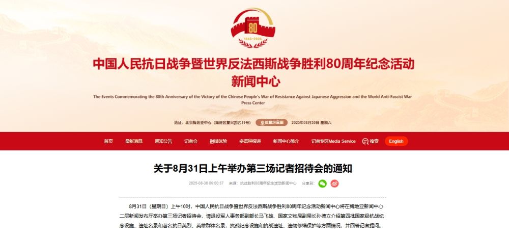 8月31日(星期日)上午10时,中国人民抗日战争暨世界反法西斯战争胜利80周年纪念活动新闻中心将在梅地亚新闻中心二层新闻发布厅举办第三场记者招待会,请退役军人事务部副部长马飞雄、国家文物局副局长孙德立介绍第四批国家级抗战纪念设施、遗址名录和著名抗日英烈、英雄群体名录,抗战纪念设施和抗战遗址、遗物修缮保护等方面情况,并回答记者提问。
