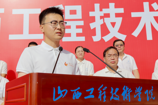 后浪奔涌,生生不息。典礼上,山西工程技术学院领导为新生代表佩戴校徽,台下新生同步佩戴。校徽落到胸前,这一象征“山西工院人”的标识,激励新生共担山西工院人的使命,共赴山西工院人的荣光。