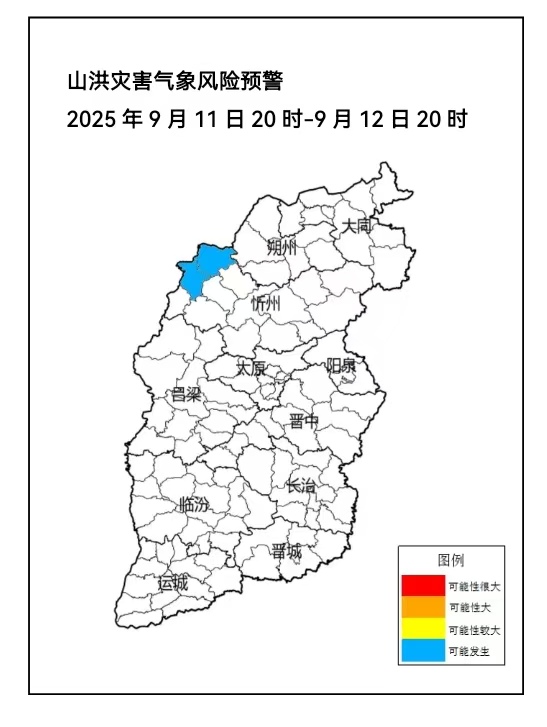 9月11日17时,省水利厅和省气象局联合发布山洪灾害气象风险预警。9月11日20时至9月12日20时,受强降雨影响,山西忻州西部2个县可能发生山洪(蓝色预警)。其他地区也可能因局地短历时强降水引发山洪灾害,各地需注意做好实时监测、防汛预警和转移避险等防范工作。