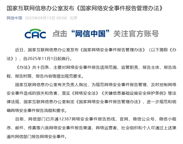 近日,国家互联网信息办公室发布《国家网络安全事件报告管理办法》(以下简称《办法》),自2025年11月1日起施行。