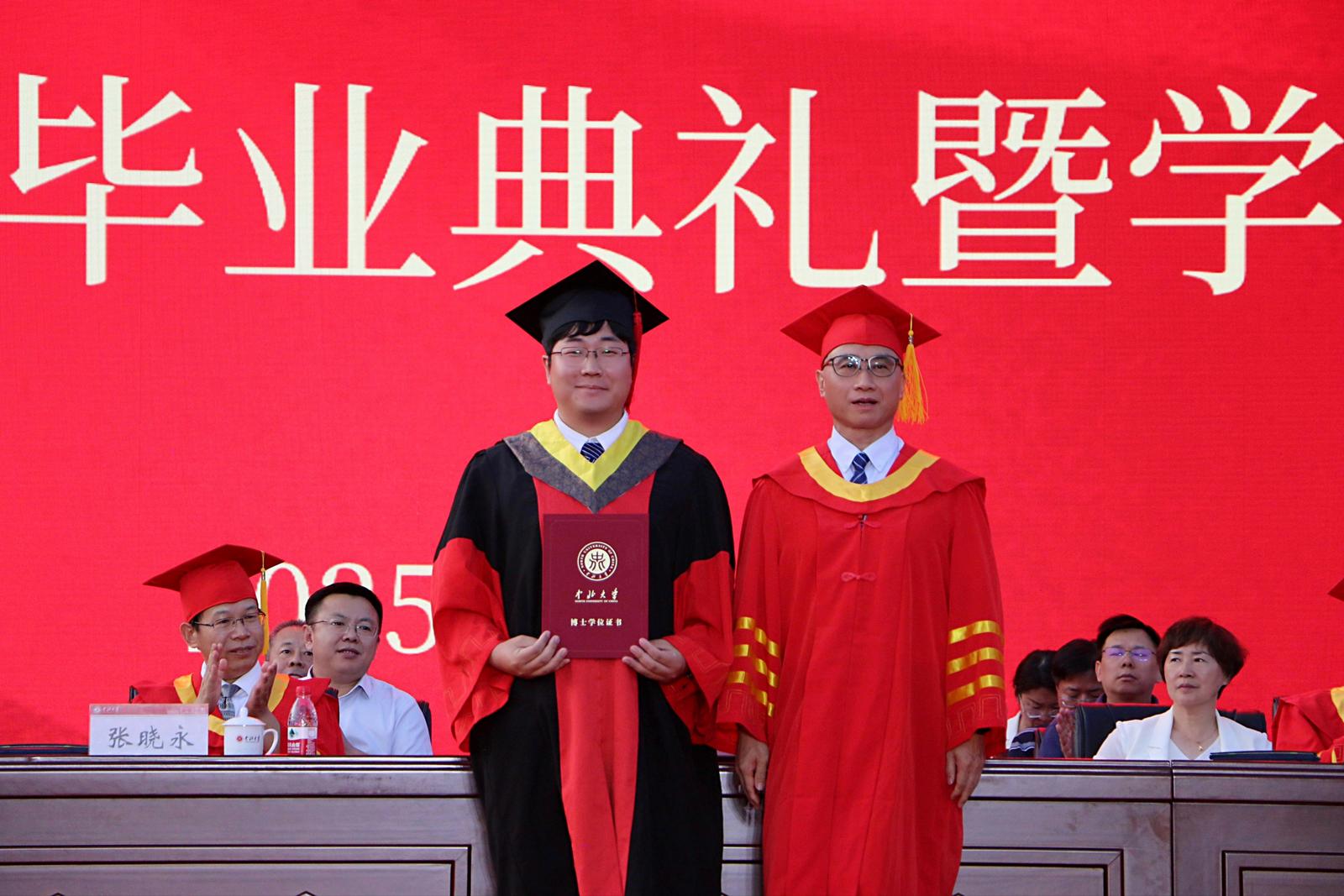 图为校长陈钱给工程博士毕业生代表卢鑫浩颁发毕业证。