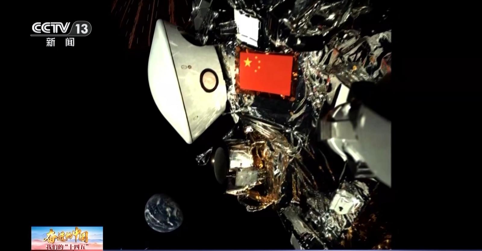 表取采样时,铲子痕迹意外形成一个“中”字形,采样结束后,嫦娥六号展示了一面以玄武岩拉丝工艺特制的五星红旗。
