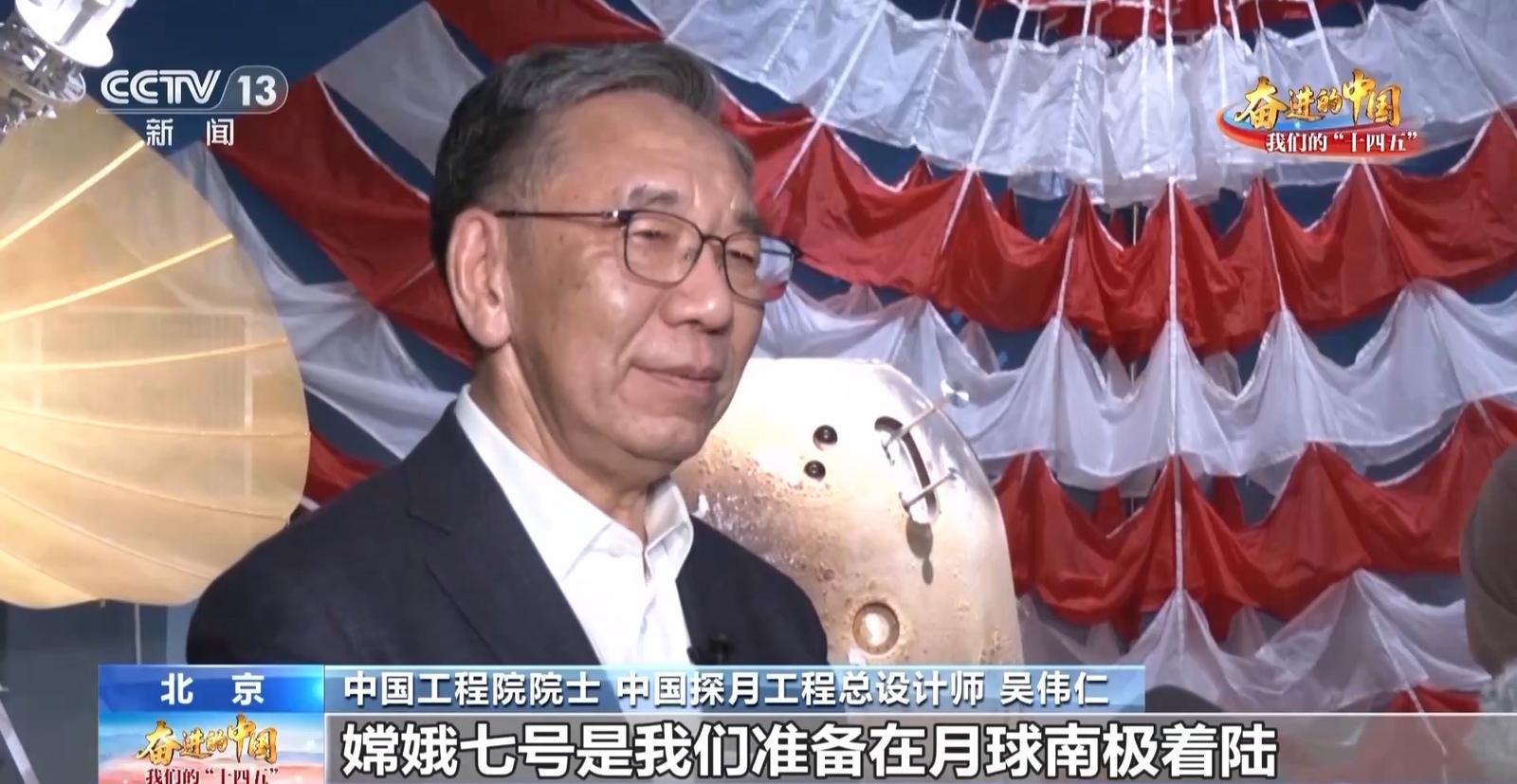 中国工程院院士 中国探月工程总设计师 吴伟仁:嫦娥七号我们准备在月球南极着陆,我们在这么一个非常非常稀罕的一个地方,可能有连续100多天光照的地方,我们要实施着陆,着陆过后,我们还要去探测水的存在,我们要飞跃,在很深的月坑里面进行探测、化验,最后得出结果。我们嫦娥七号的任务很艰巨,但是也很光荣,如果能够看到月球上有水,我认为那是对人类的最大的贡献。