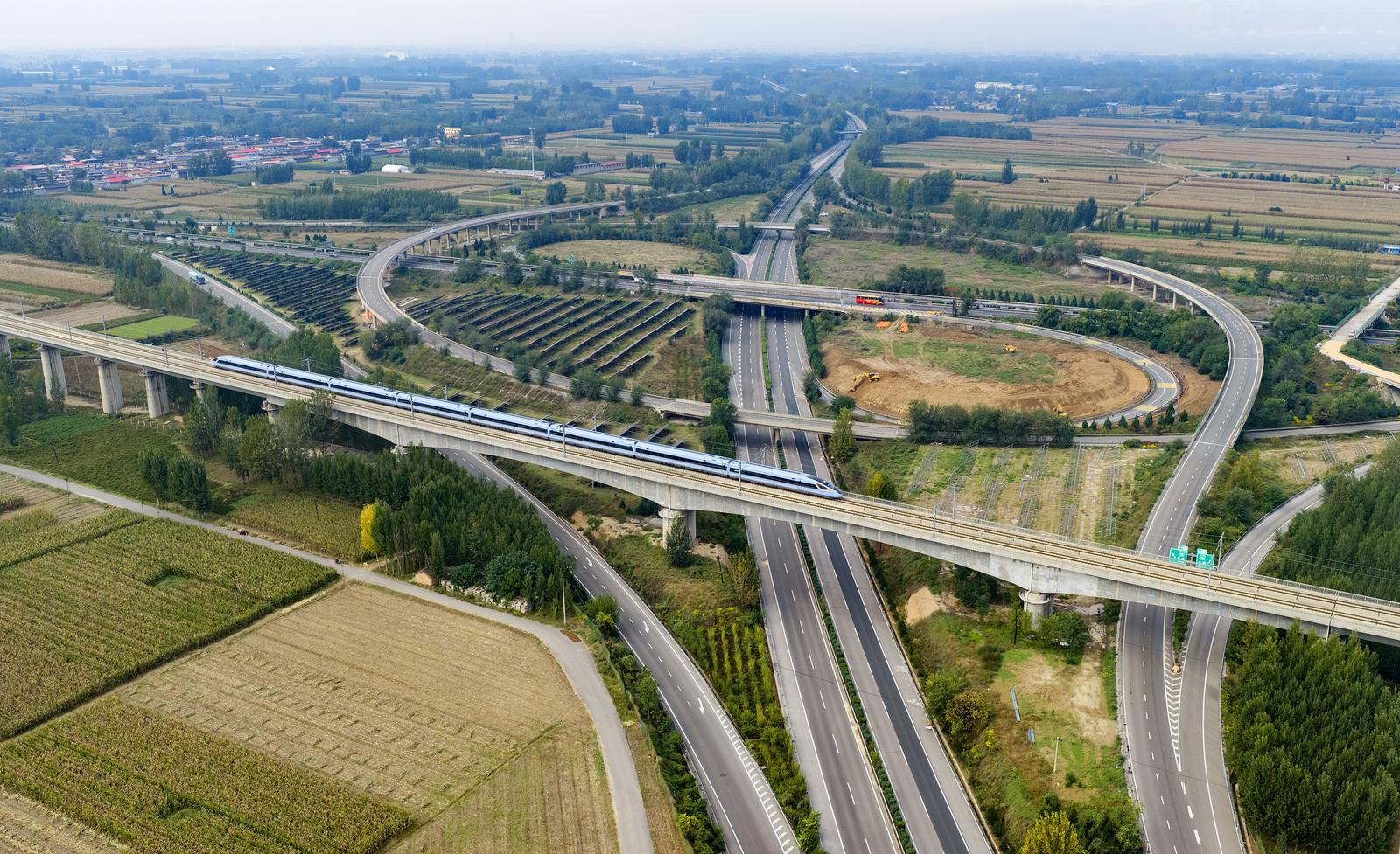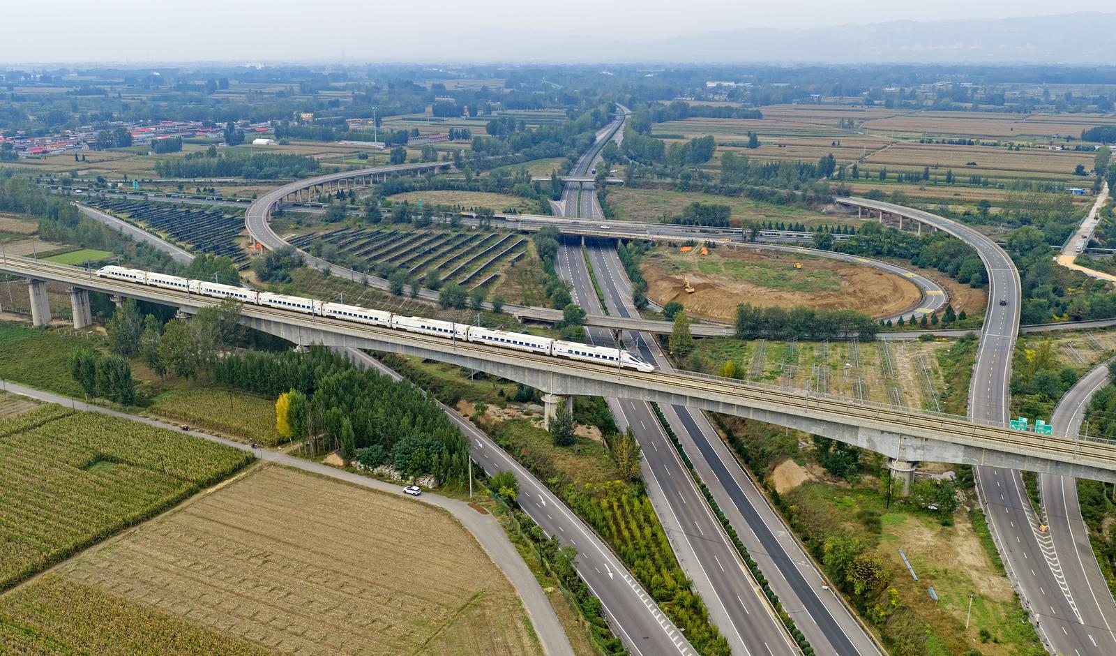 10月21日,山西省临汾市襄汾县,一列动车组列车行驶在大西高铁线上,一旁的高速公路犹如“长龙”穿越田野,二者与蓝天白云、美丽村庄交相辉映,美不胜收。