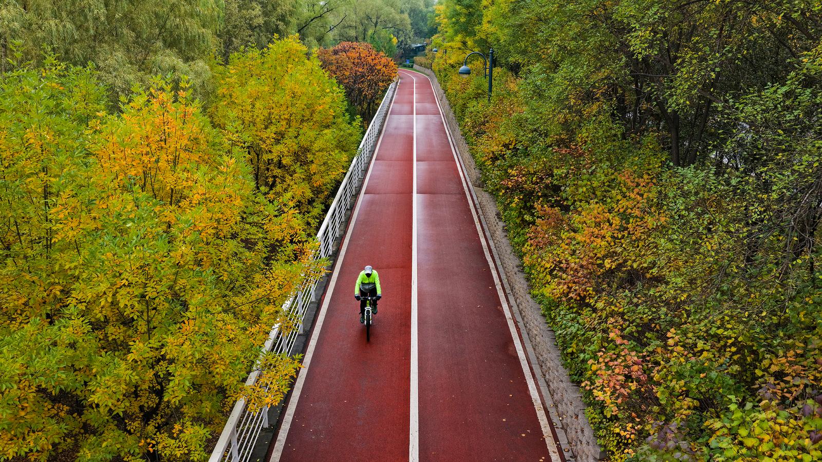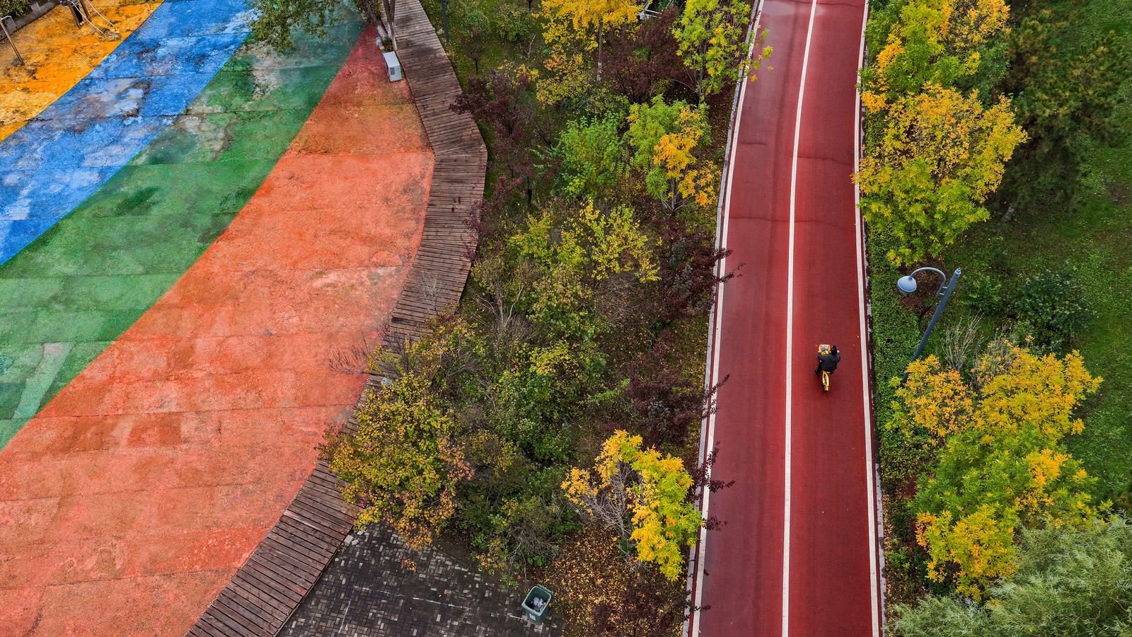 10月22日,太原市民在秋色斑斓的滨河自行车道上畅行。