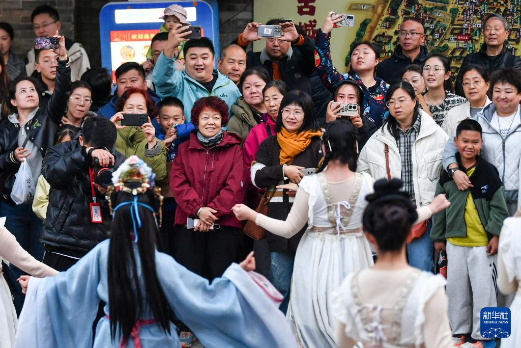 10月23日,游客在忻州古城内观看表演。