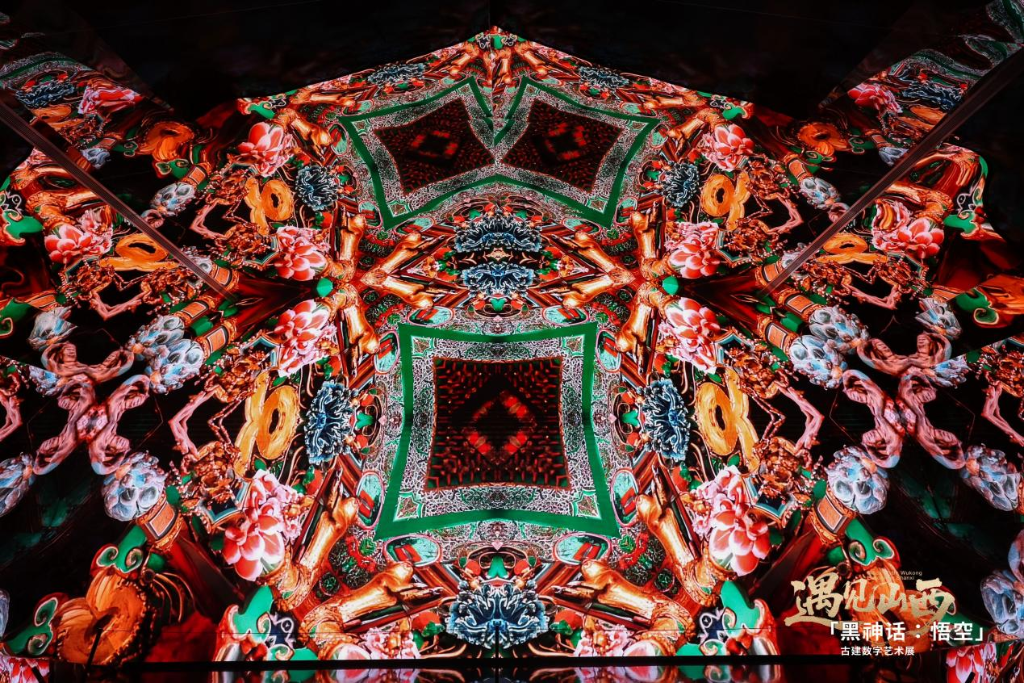 在「黑神话:悟空」遇见山西——古建数字艺术展中,在光影与镜面下,小西天变身“悬塑万花筒”。新华网 发