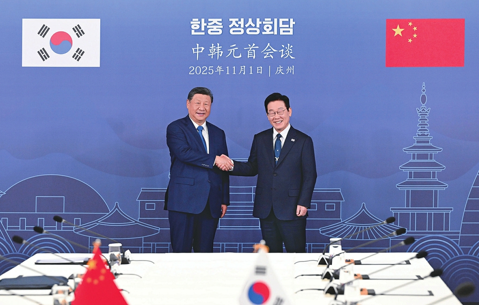 当地时间11月1日下午,韩国总统李在明同中国国家主席习近平在庆州博物馆举行会谈。