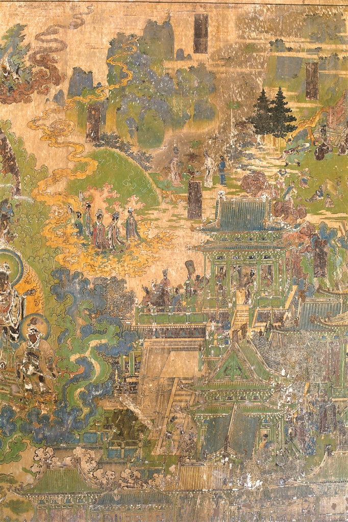 但岩山寺金代壁画有确切年代,是御前承应画匠王逵用10年时间才完成这一煌煌巨制。800多年前,王逵面对四壁,决然舍弃惯常的连环画形式,大胆独创,采用满幅构图形式,以一组繁杂的宫廷建筑为中心,配以各种故事情节画面,然后用山水、树石、云岚连结,细部真实,透视准确,远看俨然一幅气势磅礴的大型山水画,近瞧却又章回分明。壁画上就有多处使用沥粉堆金装饰,显现金碧辉煌、富丽非凡的效果。这样大面积的工笔重彩画,一丝不苟,找不到起稿与粉本痕迹,而且线条变化多样,无一废笔,令人惊叹。