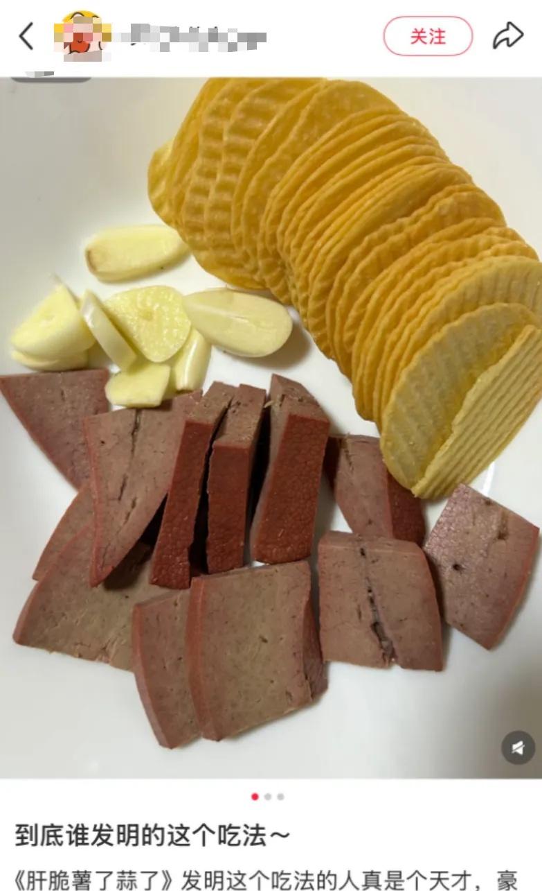 最近,一种被网友起名为“肝脆薯了蒜了”的零食组合爆火。在不少视频中,博主们将搭配好的卤制猪肝、酥脆薯片与辛辣生蒜片混合在一起食用,连连表示“上头”“绝配”。还有不少人在跟风尝试过后认为解锁了“神仙吃法”。