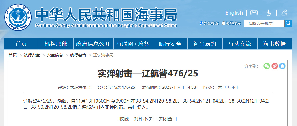 据中国海事局网站消息,大连海事局发布航行警告,11月13日6时至9时,渤海部分海域进行实弹射击,禁止驶入。