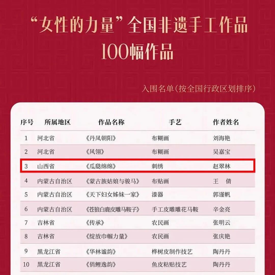 赵翠林是“高平绣活”唯一的国家级非遗传承人,山西省工艺美术大师,拥有个人知识版权32项。从小受母亲剪纸、父亲书法的艺术启蒙,辗转多地学艺后毅然回乡,投身高平绣活的传承与创新。2009年,她创办凤林刺绣厂,培训绣娘超300人,不少人还成了市级工艺美术大师,其作品多次荣获国家级、省级大奖,产品远销海外,甚至进入阿联酋迪拜购物中心专柜,让晋城非遗走向世界。