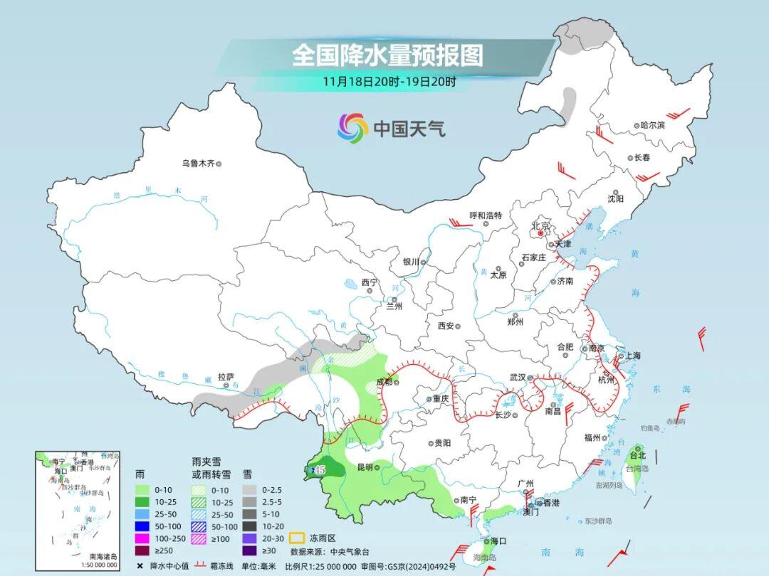 明天,西南到江南、江淮一带的降水将基本结束,仅华南西部仍有弱阴雨天气。从19日开始,除西藏、四川、云南部分地区还有弱雨雪天气外,全国大部分地区将进入雨雪稀少时段。