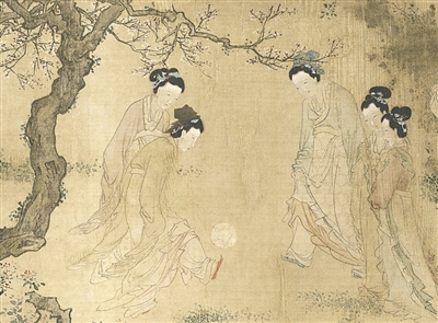 “蹴踘屡过飞鸟上,秋千竞出垂杨里”,王维生动描写了唐代蹴鞠运动的精彩时刻。据《轩辕黄帝传》记载,黄帝发明蹴鞠以训练军队体能。汉代,蹴鞠被视为“治国习武”之道,到宋代它发展为一项“全民运动”。元代钱选的《蹴鞠图卷》,便展现了宋代开国皇帝赵匡胤与其弟和大臣们蹴鞠的场景,蹴鞠者竞技之动势与围观者凝神之静态相映成趣。蹴鞠在民间也颇为流行。辽宁省博物馆所藏明代仇英《清明上河图卷》,就捕捉到市井间一场蹴鞠比赛。画面中围观者的视线紧随球的运动而动,可见比赛之激烈。而明代杜堇《仕女图卷》(局部见图)则描绘了女性蹴鞠之乐。这颗小小的鞠球从历史画卷中跃然而出,演变成为今日的足球,串联起古今如一的运动热情。