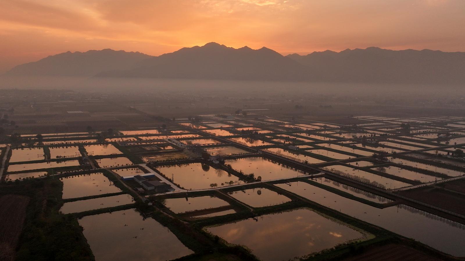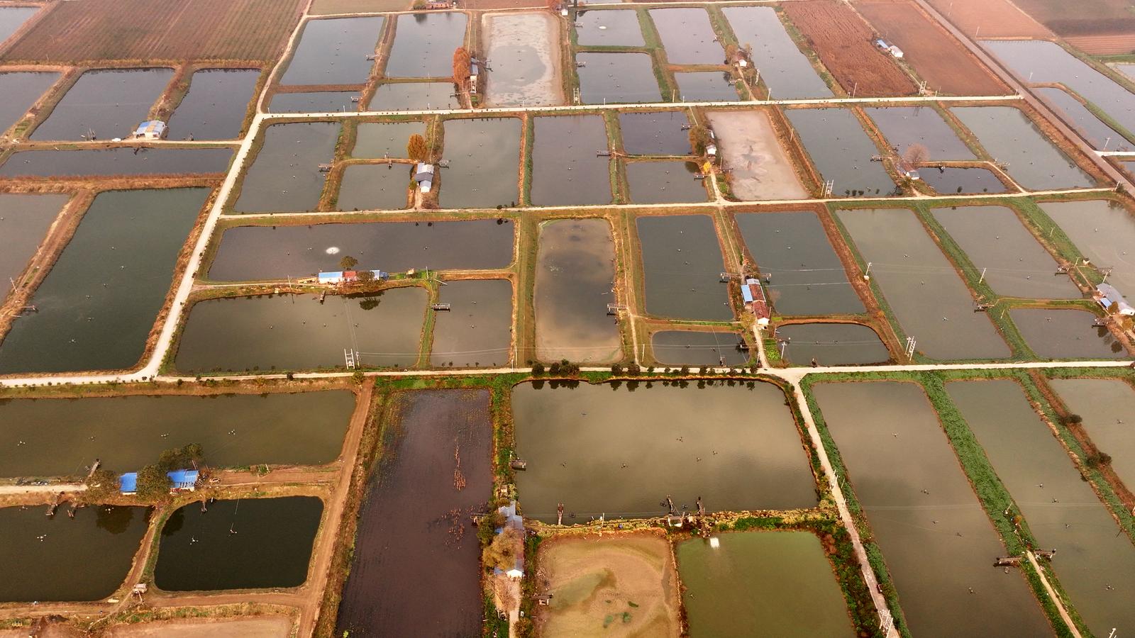 11月15日清晨,山西永济蒲州镇万亩水产养殖基地迎最美晨光。温柔朝霞漫洒塘面,为片片水塘披上金红纱衣,微风轻拂,波光粼粼,层层涟漪折射斑斓光影,仿佛无数碎金在跳跃。