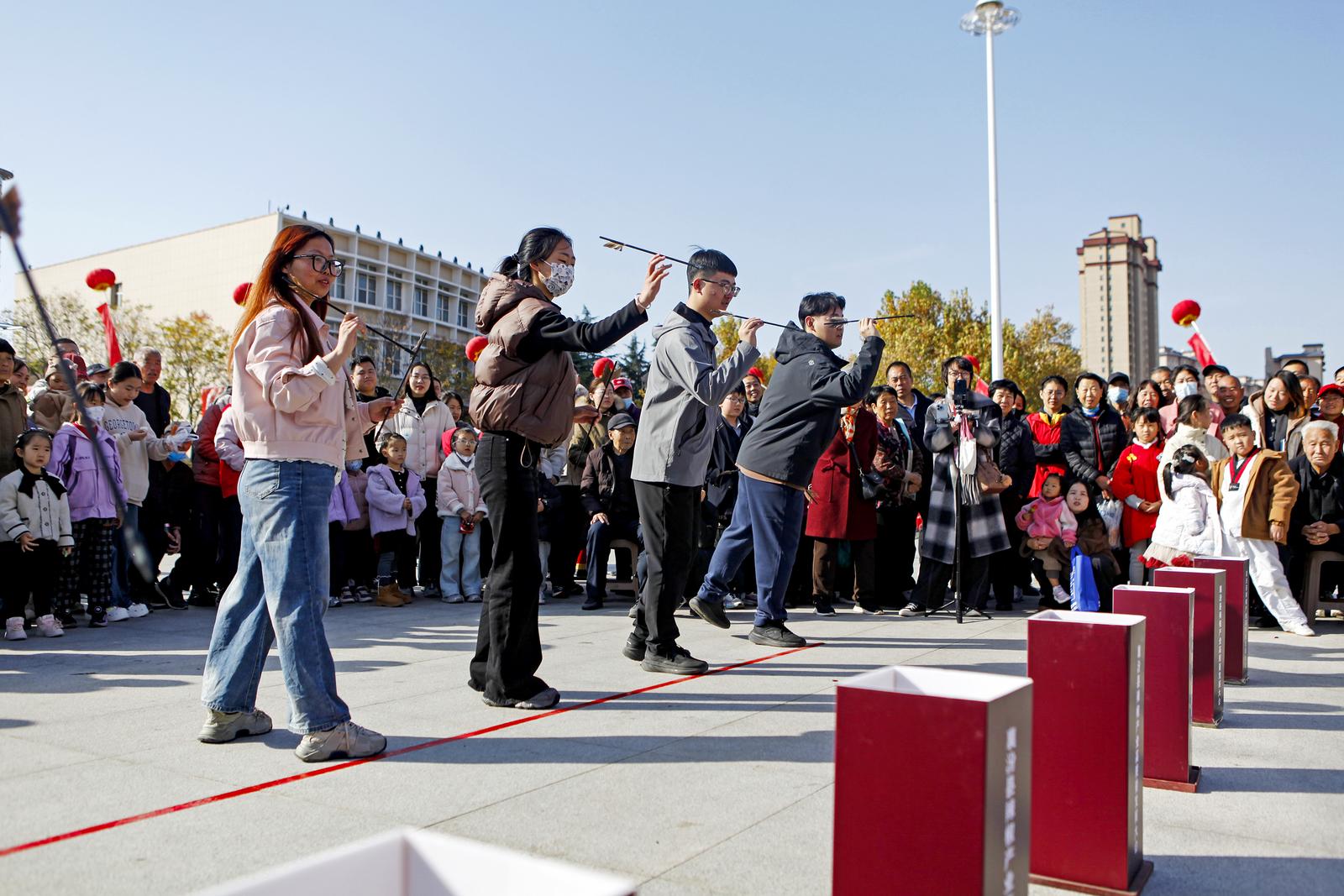 11月16日,在临汾市襄汾县丁陶文化广场,乡镇代表队在参加趣味运动会。