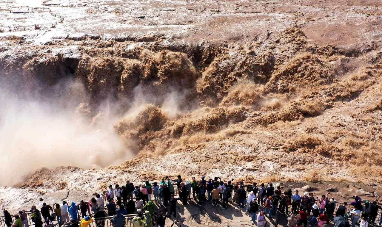 9月23日,游客在山西吉县黄河壶口瀑布景区游览观瀑(无人机照片)。新华社发(吕桂明摄)